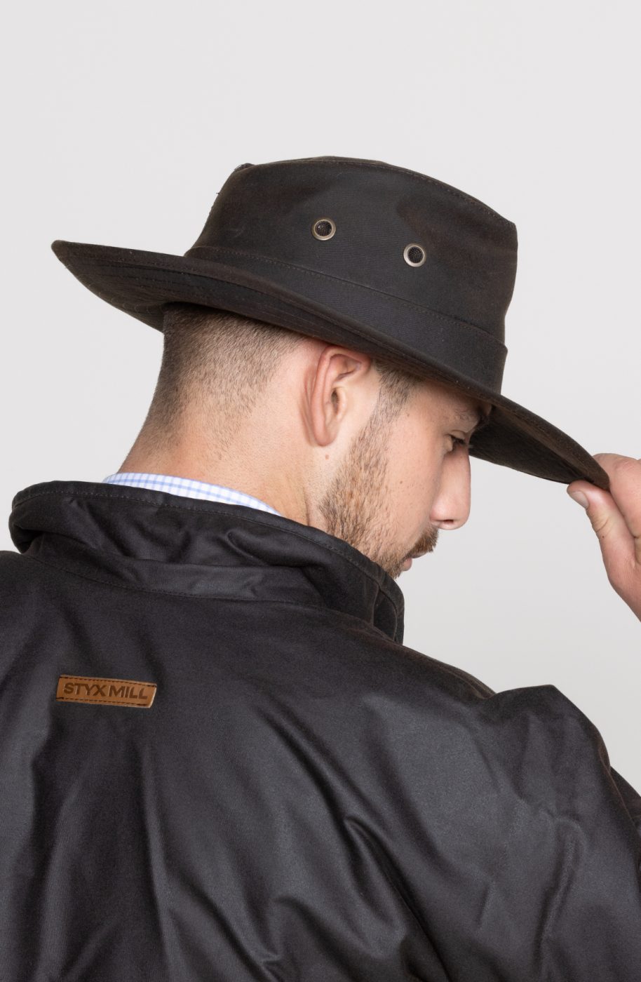 Oilskin Wide Brimmed Hat; tough and durable material with exceptional quality. Features include wide curved brim, mesh eyelets, chin cord with adjustable toggle/keeper. A versatile hat to keep you protected from sun, rain and all elements.