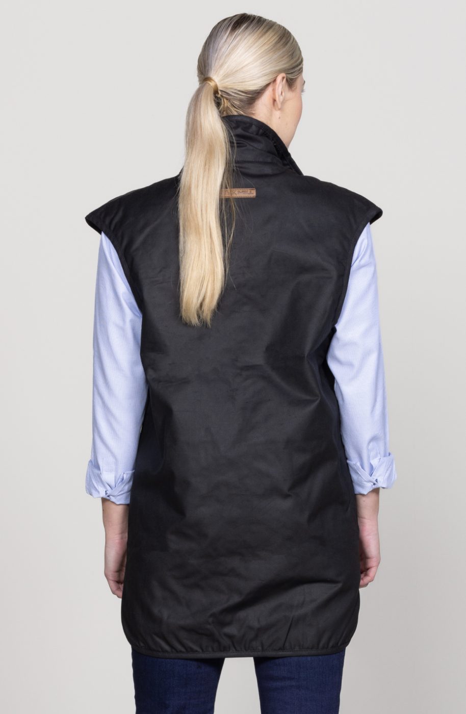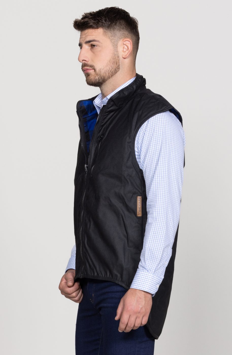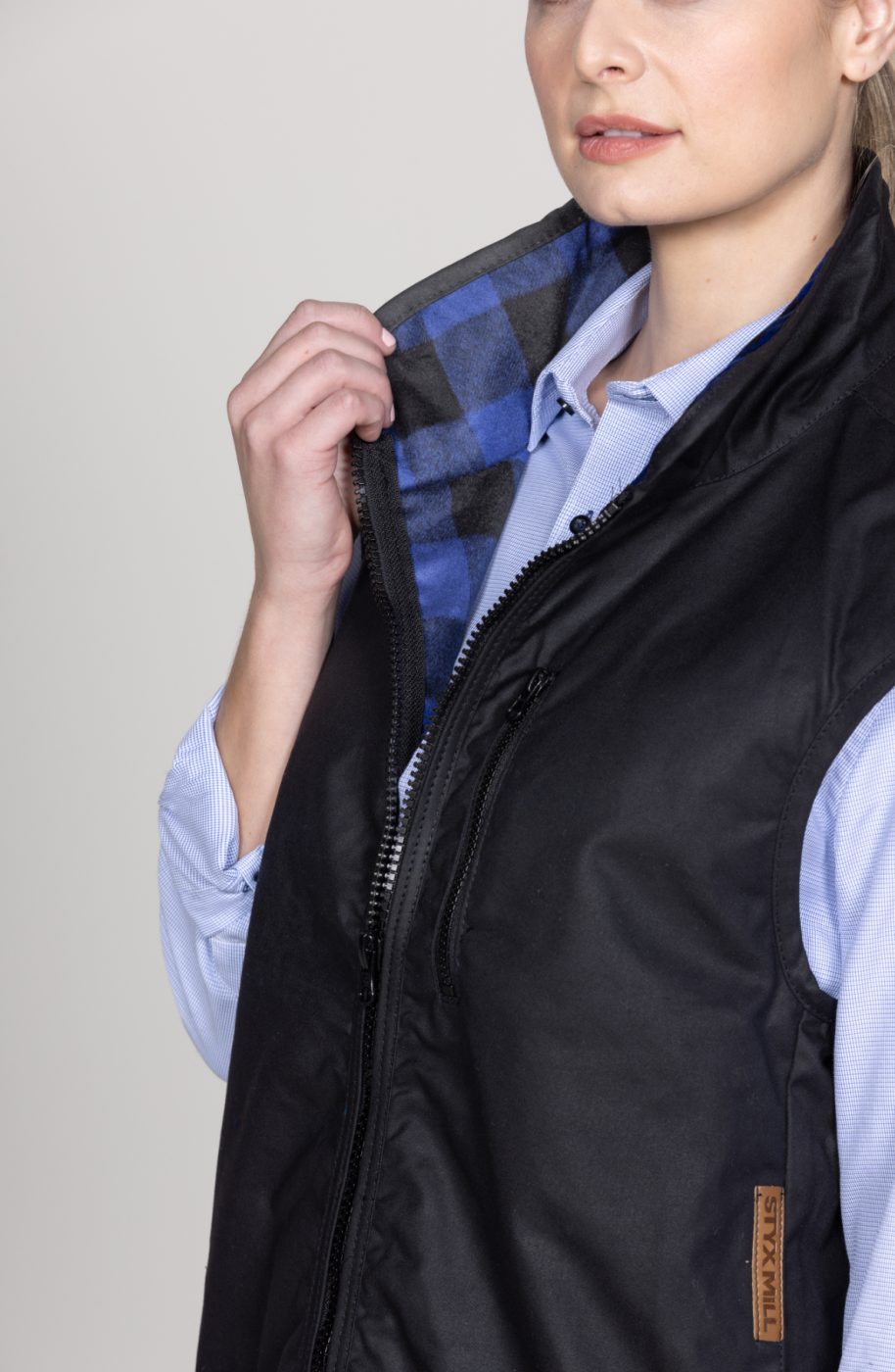 Our original Styx Mill Vest in black oilskin wax with blue check liner; tough and durable material with performance and quality. Functionality include chest zip pocket, two hand warmer pockets, full front zip with a soft wool blend blue check liner and drop-tail to ensure the back is protected. A lightweight vest that ensures warmth and comfort in all elements.